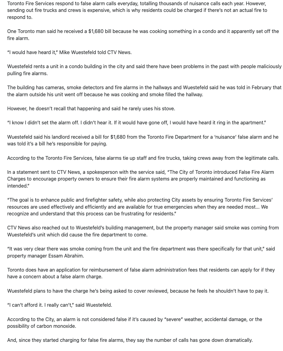 ‘I can’t afford it. I really can’t’: Toronto man hit with $1,600 bill for ‘nuisance’ fire alarm. By Pat ForanOpens in new window Published: July 17, 2025 at 6:07AM EDT